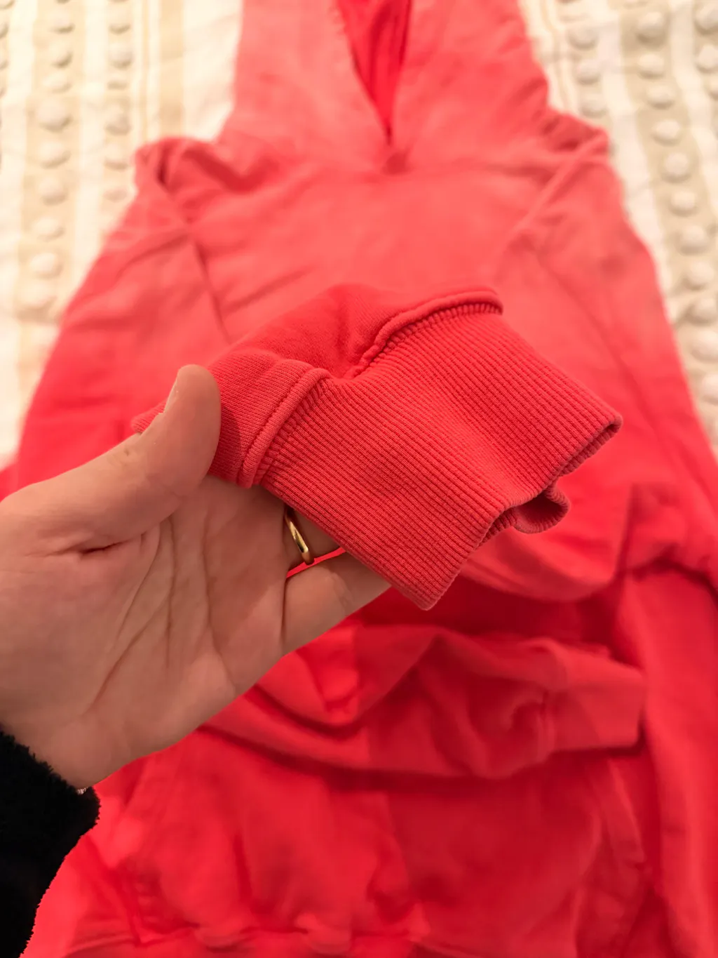 It's very warm and cozy. I would like it if the large fits a little bit looser and longer on me. But, it will fit my boyfriend perfectly. Seemingly, it feels as it was "made explicitly for him".